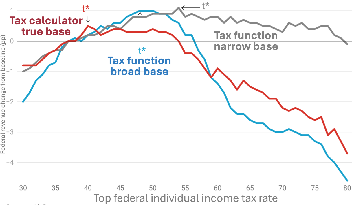[Abstract] The Laffer curve peaks at the revenue-maximizing top tax rate, where revenue losses from behavioral responses offset revenue gains from a higher tax rate. Prior studies, however, largely overlook the Laffer curve's shape, rely on simplified tax functions, and often omit shifting across business types and tax interactions. We show that modeling distinct tax bases more accurately and incorporating these interactions lowers the revenue-maximizing top tax rate and the associated revenue gains, yielding "flat" Laffer curves. Over this flat region, increasing the top tax rate raises relatively little revenue. Instead, raising top rates primarily trades off between progressivity and growth.